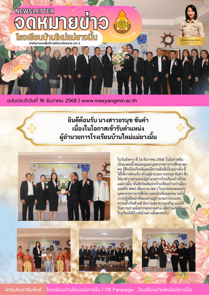ในวันอังคาร ที่ 16 ธันวาคม 2568 ในโอกาสอันเป็นมงคลนี้ คณะครูและบุคลากรทางการศึกษาทุกคน รู้สึกเป็นเกียรติและมีความยินดีเป็นอย่างยิ่ง ที่ได้ให้การต้อนรับ ท่านผู้อำนวยการอรนุช ขันคำ ซึ่งได้มาดำรงตำแหน่งผู้อำนวยการโรงเรียนบ้านใหม่แม่ยางมิ้น ต้นสังกัดเดิมจากโรงเรียนบ้านป่าเมี่ยงแม่พริก สพป.เชียงราย เขต 2 ในนามของคณะครู บุคลากรทางการศึกษา และนักเรียนทุกคน ขอให้ การปฏิบัติหน้าที่ของท่านผู้อำนวยการประสบความสำเร็จด้วยดี มีความสุข ความเจริญ และได้รับความร่วมมือจากทุกภาคส่วน เพื่อร่วมกันพัฒนาโรงเรียนให้ก้าวหน้าอย่างมั่นคงต่อไป