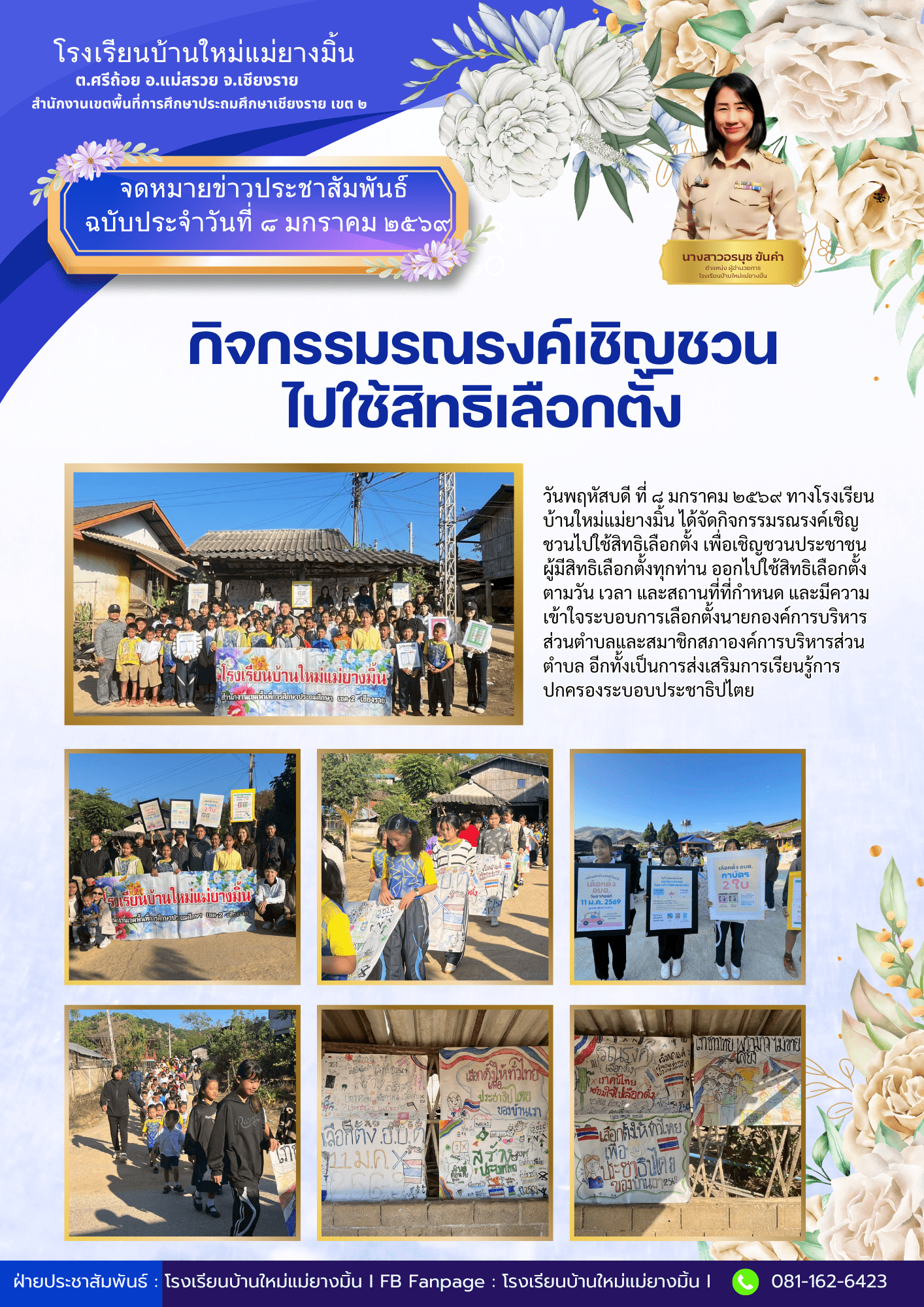 วันพฤหัสบดี ที่ ๘ มกราคม ๒๕๖๙ ทางโรงเรียนบ้านใหม่แม่ยางมิ้น ได้จัดกิจกรรมรณรงค์เชิญชวนไปใช้สิทธิเลือกตั้ง เพื่อเชิญชวนประชาชนผู้มีสิทธิเลือกตั้งทุกท่าน ออกไปใช้สิทธิเลือกตั้งตามวัน เวลา และสถานที่ที่กำหนด และมีความเข้าใจระบอบการเลือกตั้งนายกองค์การบริหารส่วนตำบลและสมาชิกสภาองค์การบริหารส่วนตำบล อีกทั้งเป็นการส่งเสริมการเรียนรู้การปกครองระบอบประชาธิปไตย